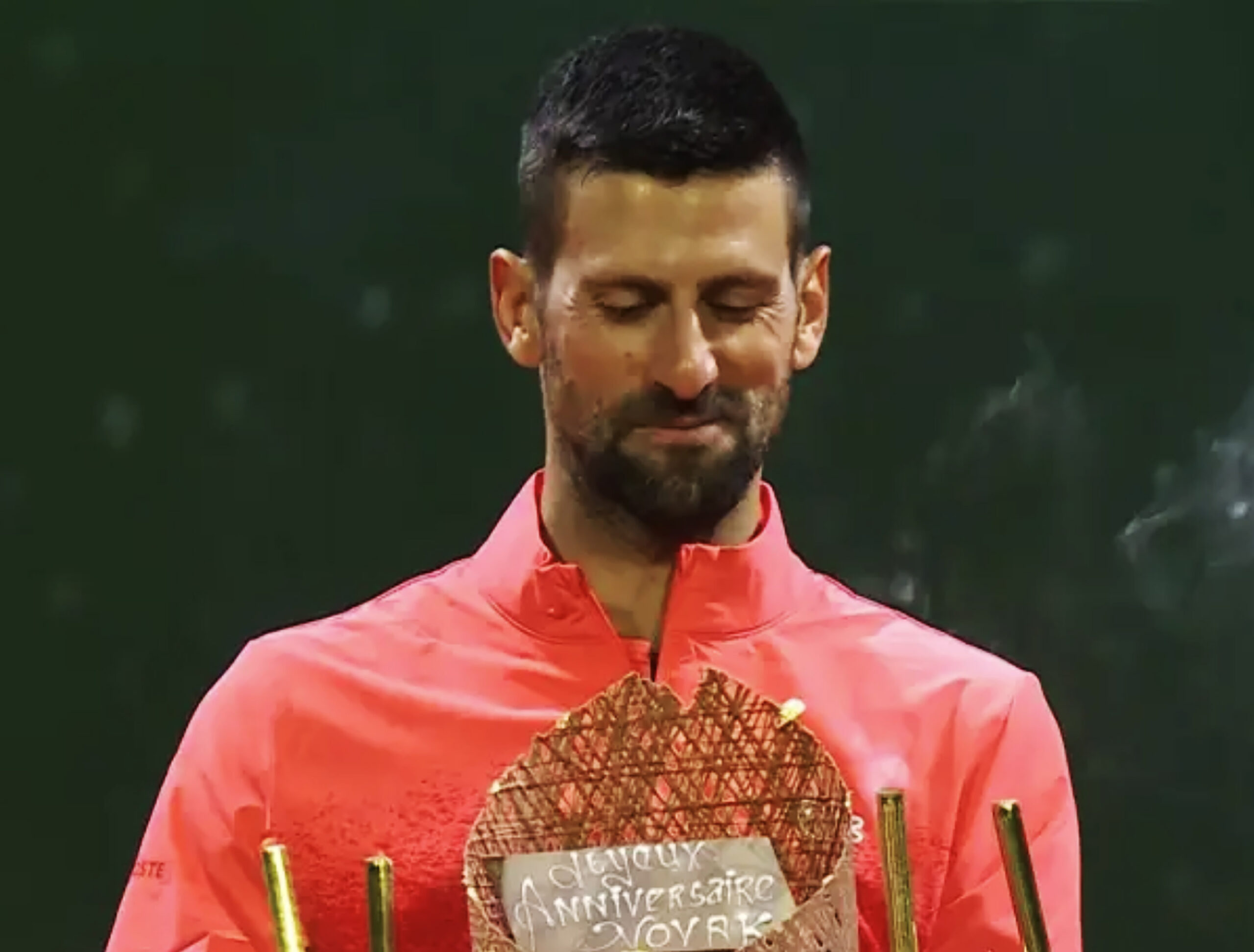 Main photo:- Birthday boy Novak Djokovic receives a cake after defeating Arnaldi
