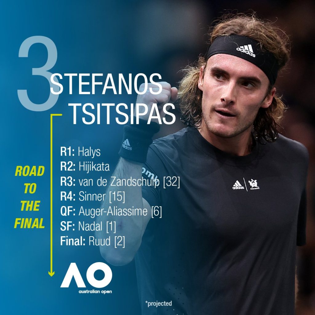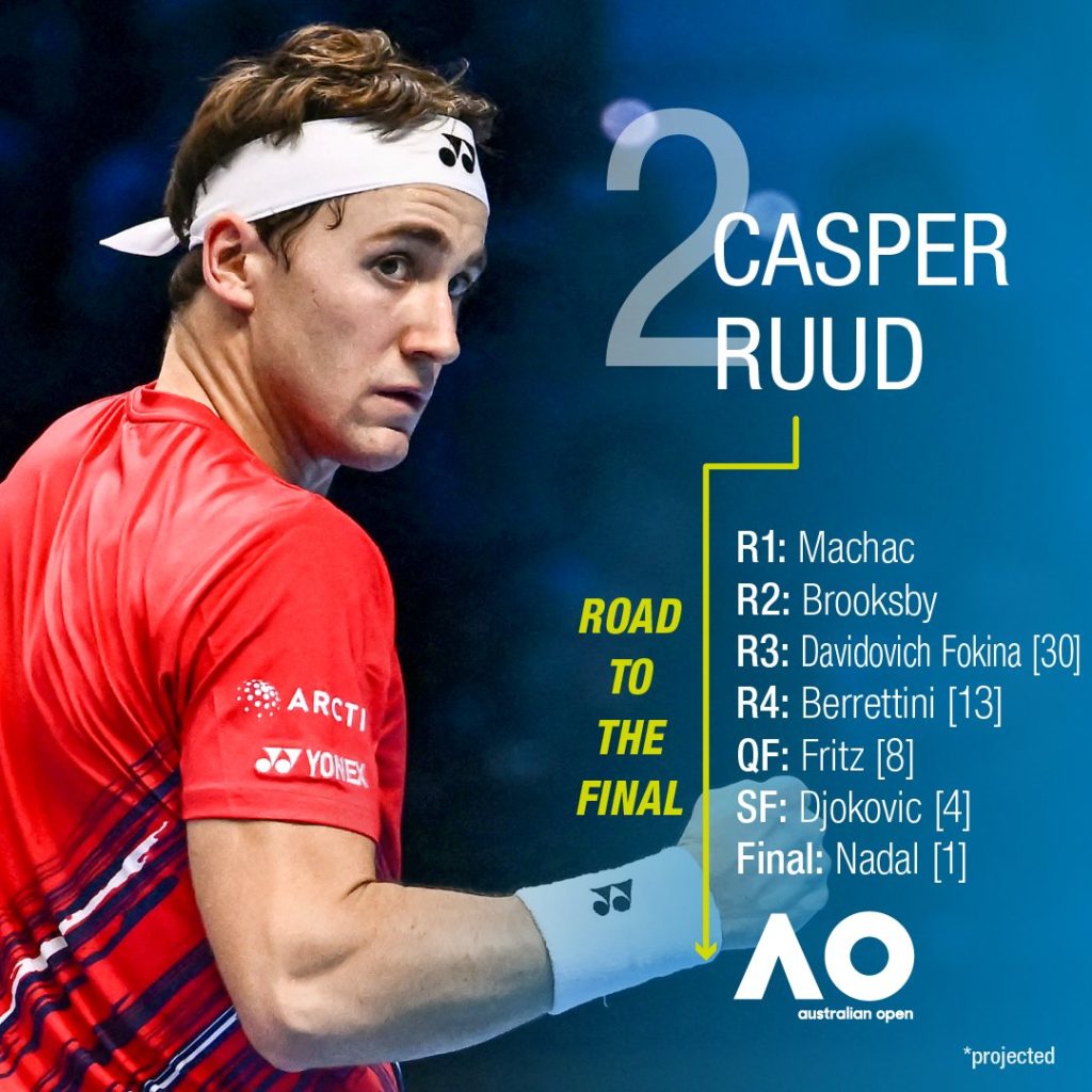 No. 2 seed Casper Ruud will meet American Taylor Fritz if projections go to plan and No.3 seed Stefanos Tsitsipas to face Canadian Felix Auger-Aliassime.