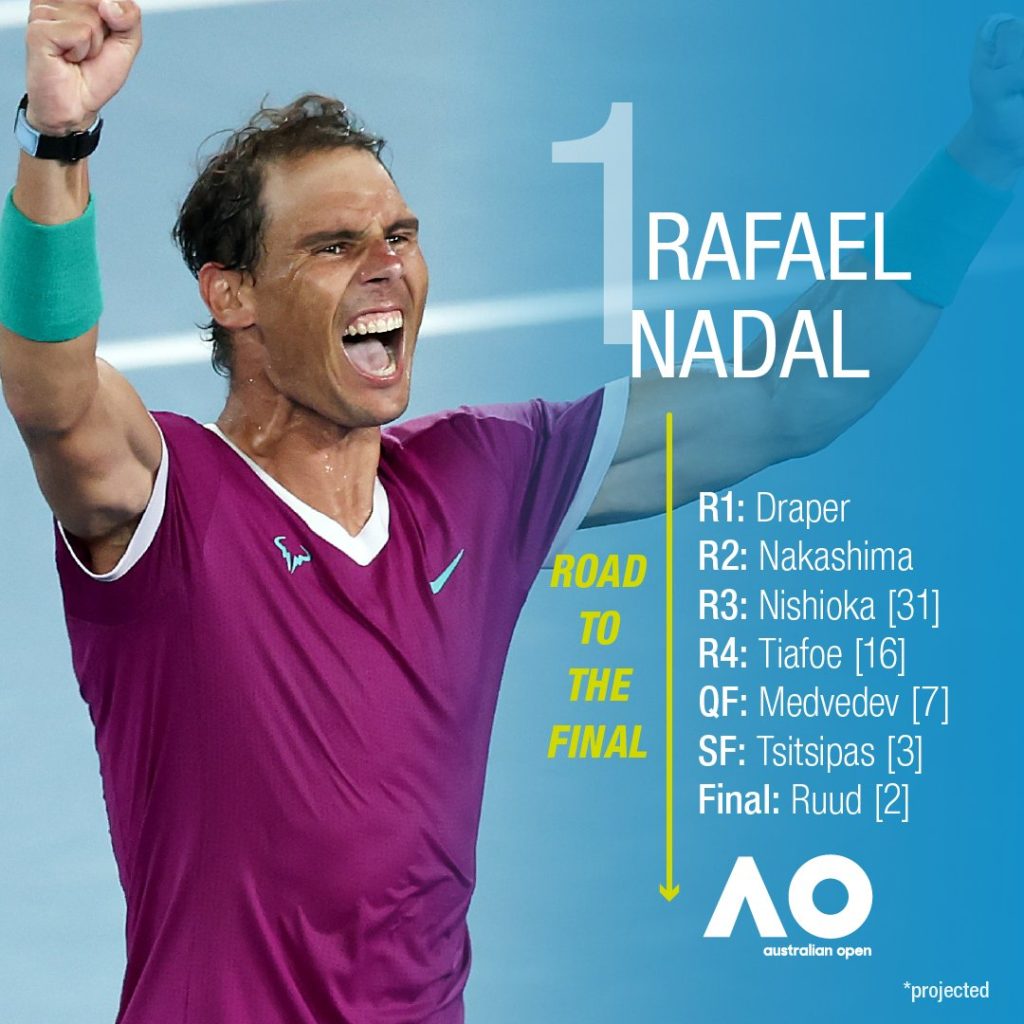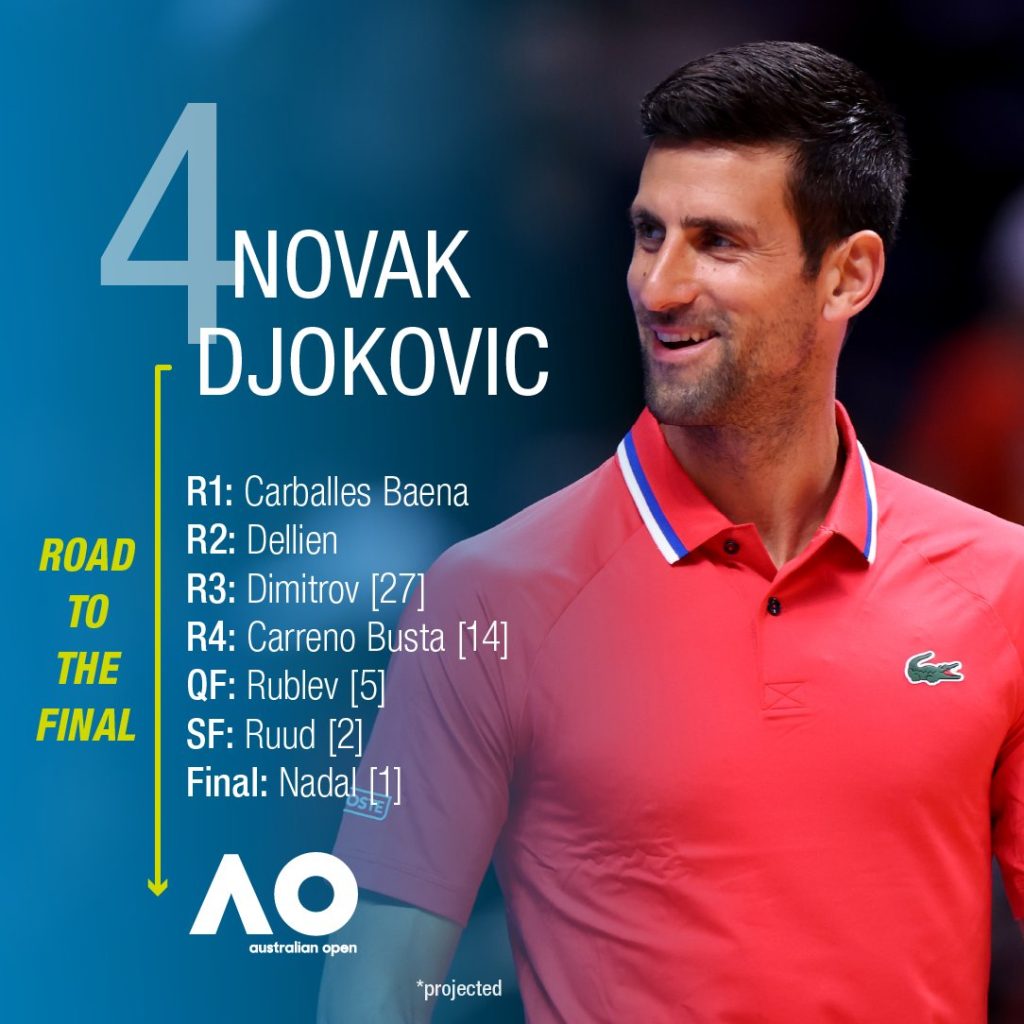 Rafael Nadal and Novak Djokovic have been drawn in opposite halves of the men’s singles draw of the 2023 Australian Open, with Nadal projected to meet Russian Daniil Medvedev in the last eight and Djokovic on track to face another Russian, Andrey Rublev.