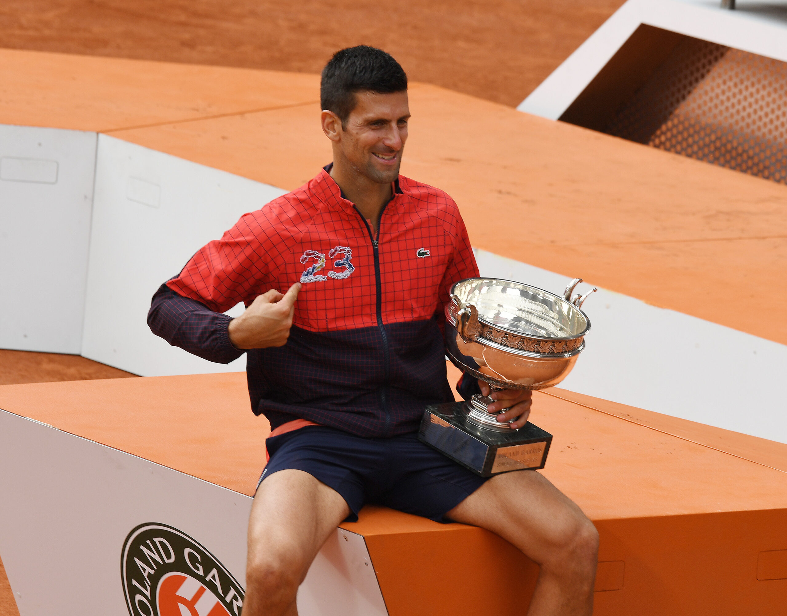 Main photo:- Roland Garros French Open 2023 Novak Djokovic with Coupe des Mousquetaires trophy after wins Men’s singles Final, a record 23 grand slams by Photo Roger Parker International Sports Fotos Ltd