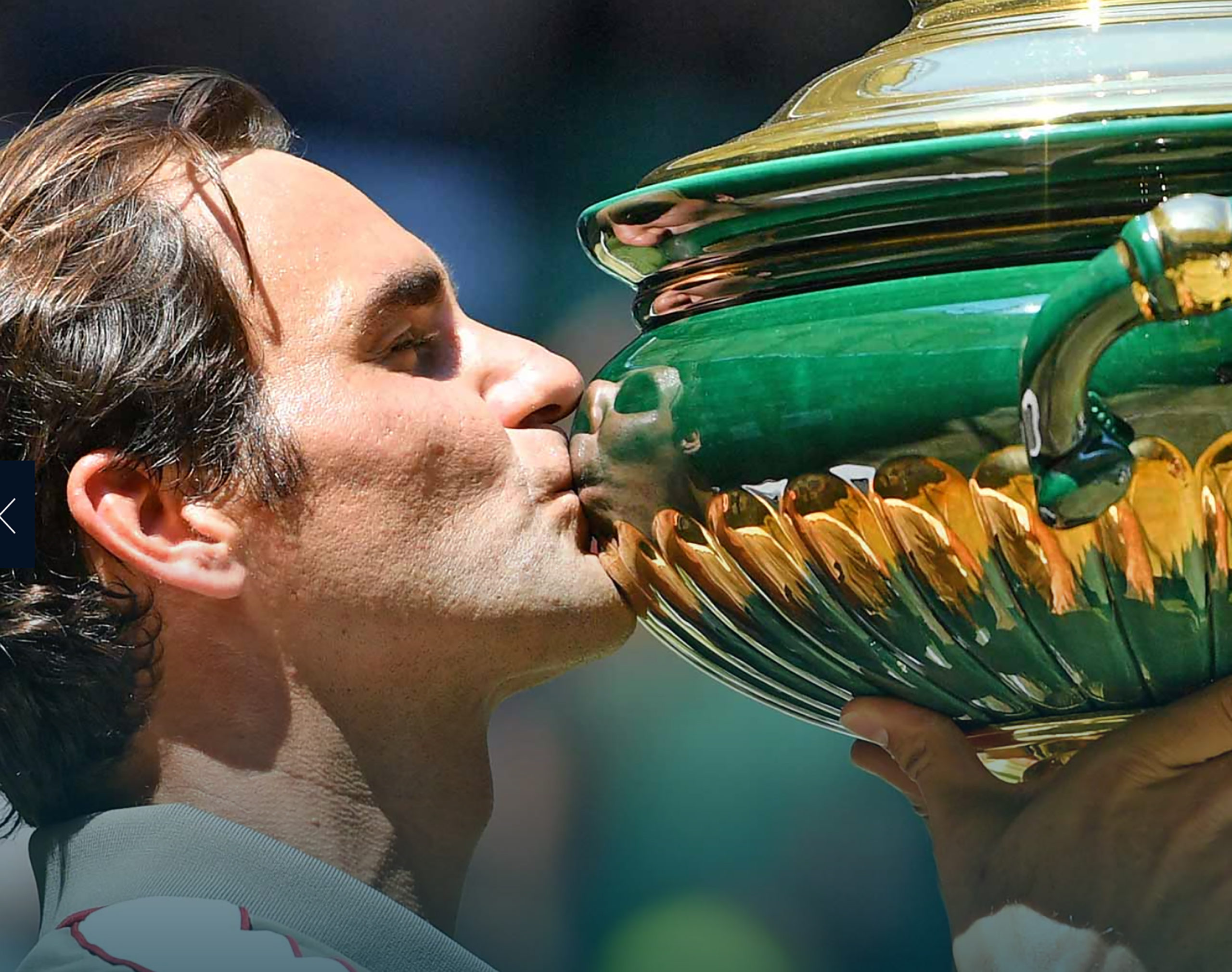 Main photo:- Roger Federer with his 10th Halle trophy – by ATPTour.com