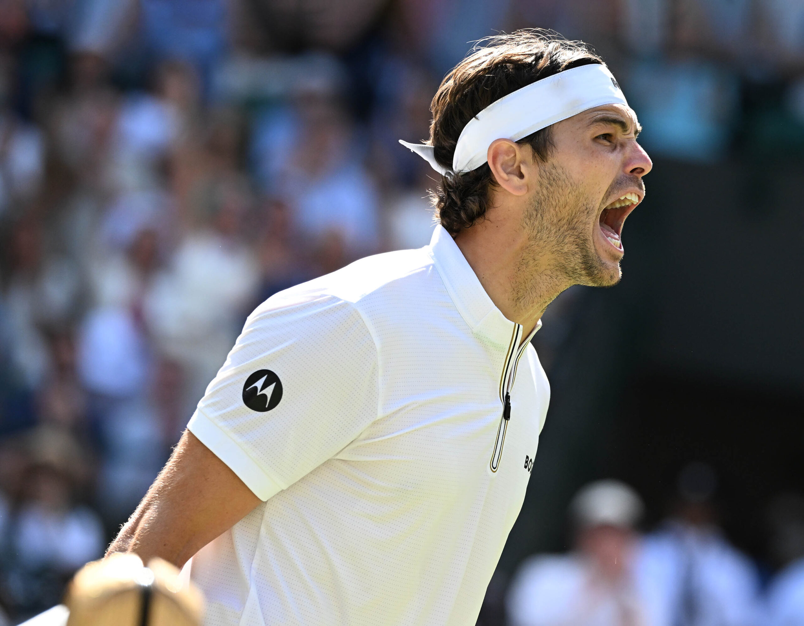 Main photo:-Wimbledon 2025 Taylor Fritz celebrates quarter final win Photo Roger Parker