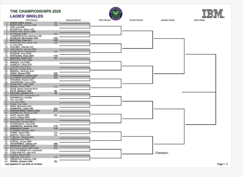 Ladie’s singles draw Wimbledon 2025