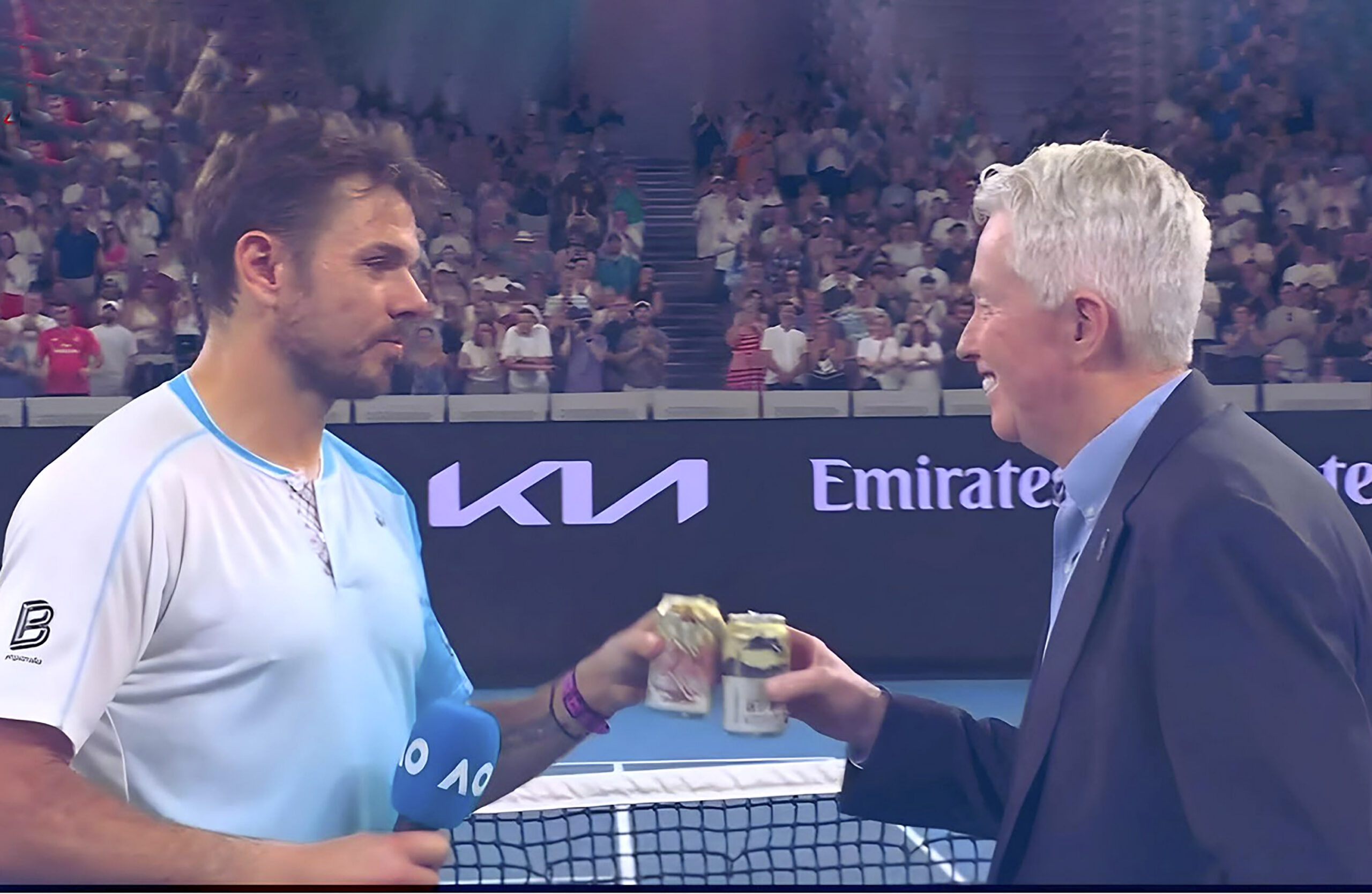 Stan shares a beer on court as his AO career ends