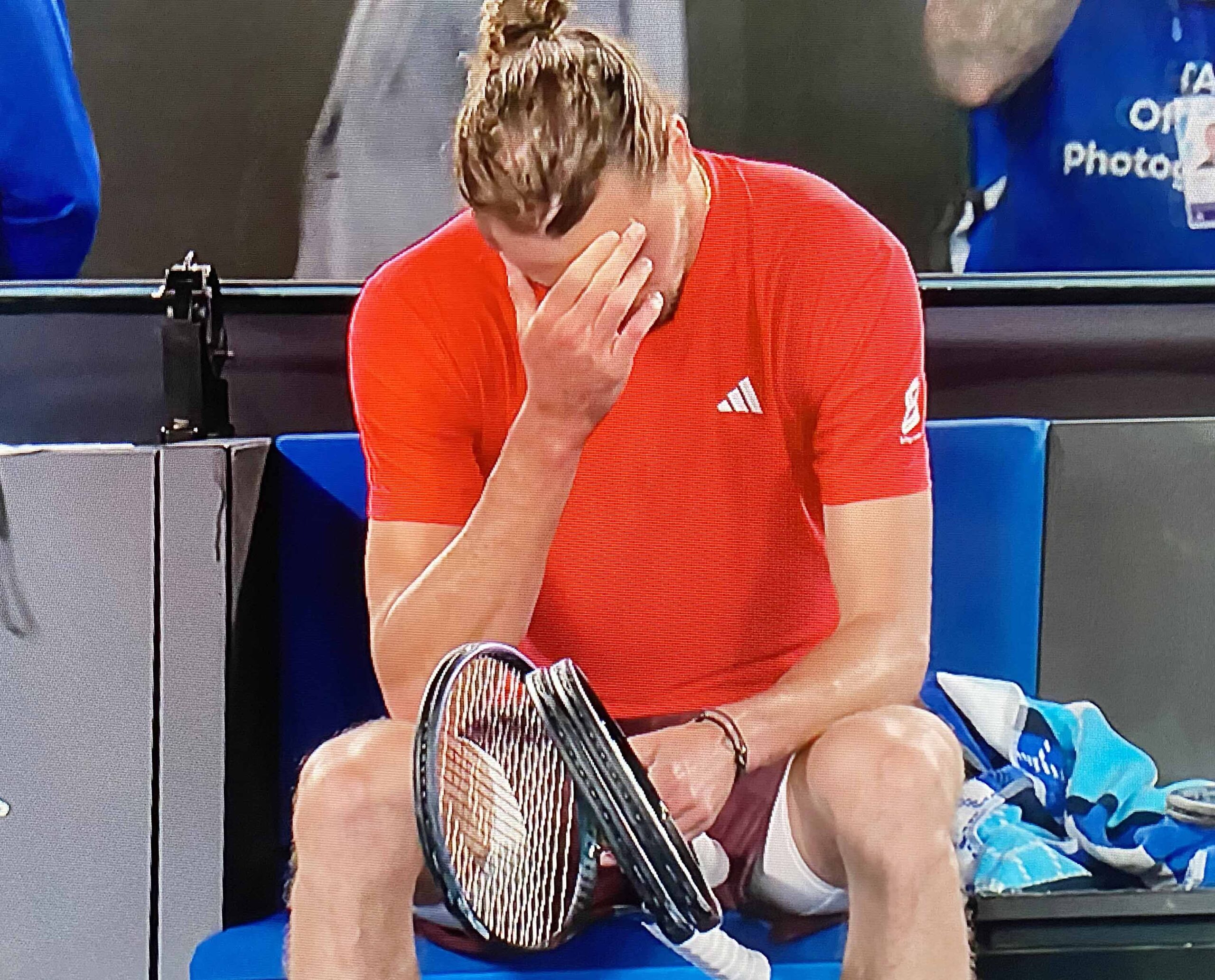 Main photo:- A dejected Alexander Zverev at his chair after defeat in AO final – by ISF Ltd