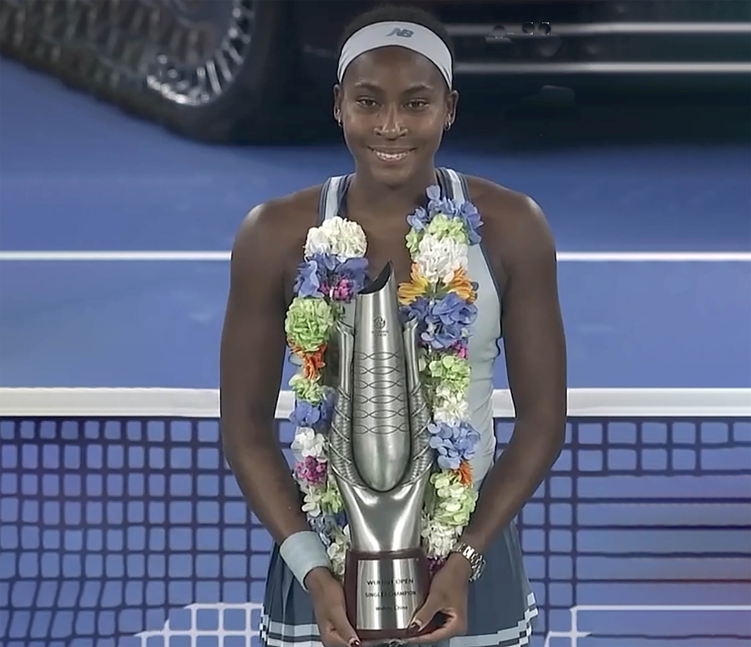 Main photo:- Coco Gauff with WTA Wuhan trophy – by WTATennis.com