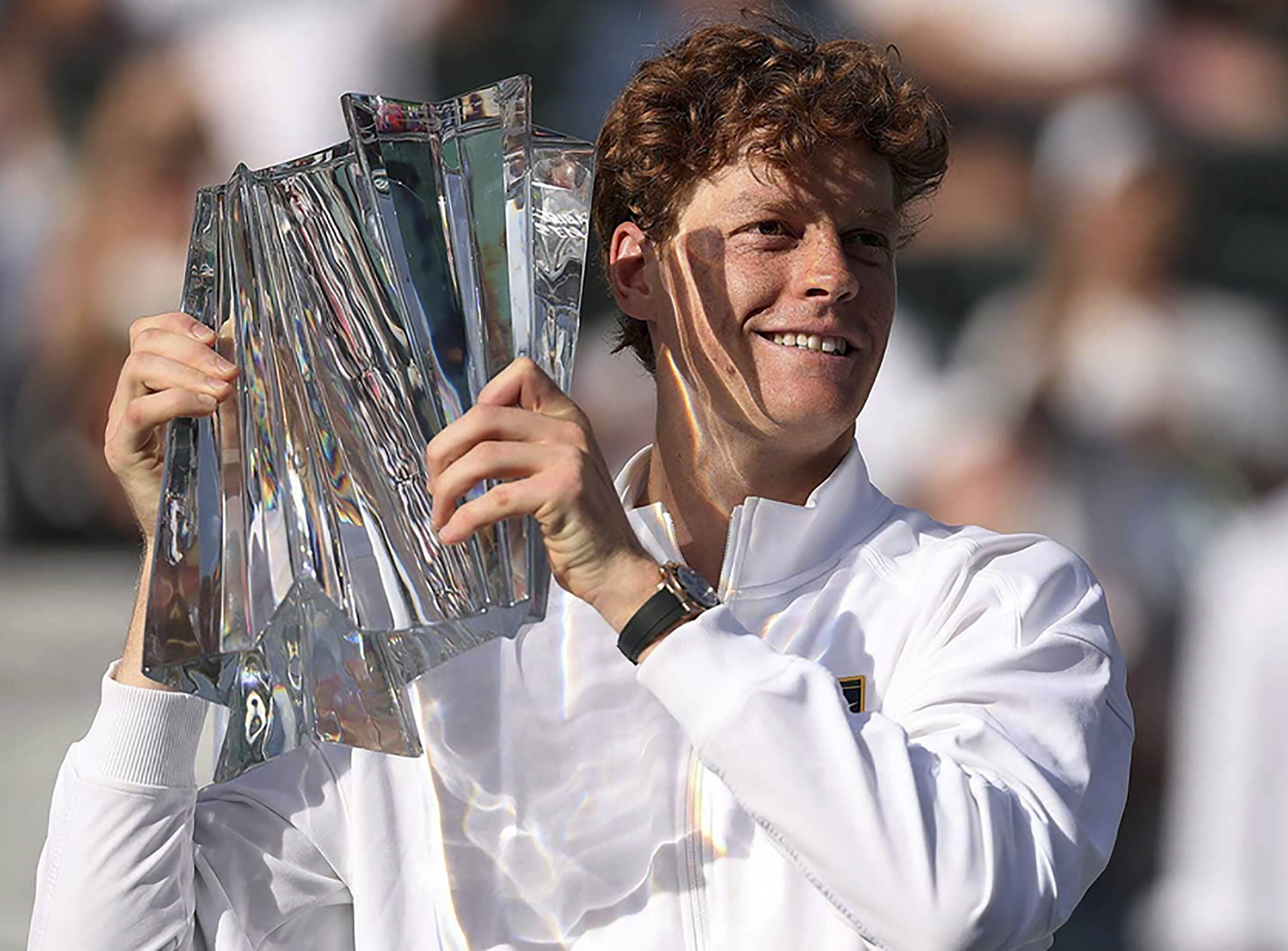 Main photo:- Jannik Sinner lifts Indian Wells Trophy – by ATPTour.com