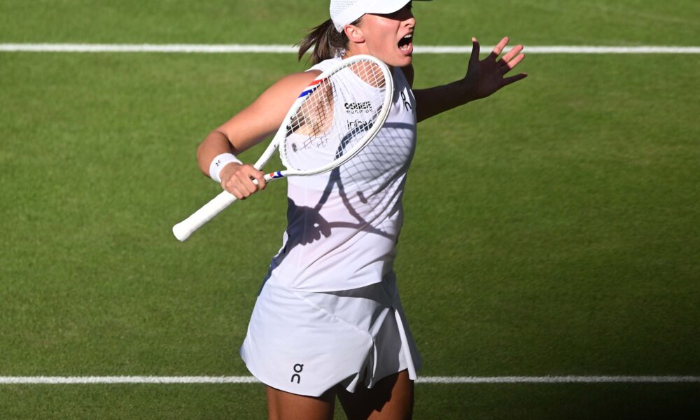 Iga Swiatek rocked into a first Wimbledon final on Thursday, with the five-time Grand Slam winner fuelled by riffs from AC-DC, Guns’n’Roses and Led Zeppelin on...